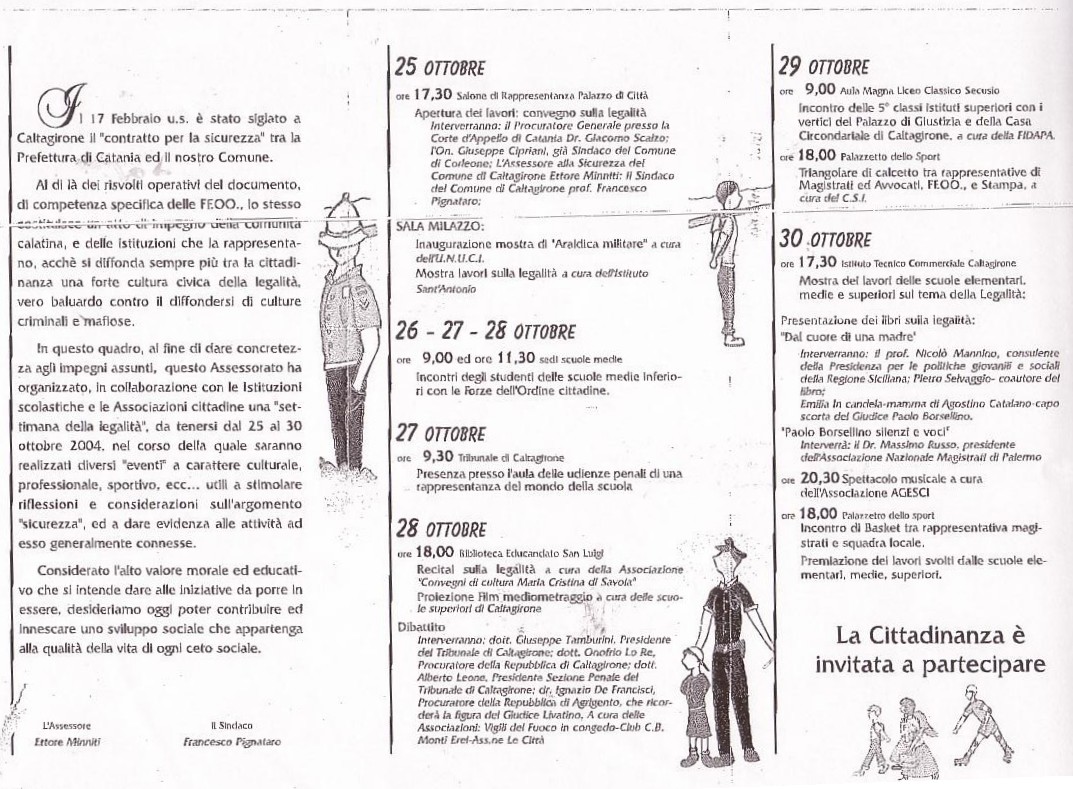 Il Comune di Caltagirone in collaborazione con le Istituzioni scolastiche e le Associazioni cittadine ha organizzato una "settimana della legalità", che si è svolta dal 25 al 30 ottobre 2004, nel corso della quale si sono svolti diversi eventi a carattere culturale, professionale, sportivo per stimolare riflessioni e considerazioni sull'argomento "sicurezza", ed a dare evidenza alle attività ad esso generalmente connesse.