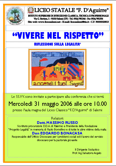Al termine del corso dal titolo "Vivere nel rispetto" svolto presso la scuola, nell'ambito delle misure previste dal POR Sicilia, si è tenuto un seminario conclusivo al quale sono interventuti: Massimo Russo (Sostituto Procuratore DDA di Palermo e Presidente della Fondazione “Progetto Legalità in memoria di Paolo Borsellino e di tutte le altre vittime della mafia” ) e Don Edoardo Bonacasa (Responsabile dell' ufficio diocesano per i problemi sociali ed il lavoro e del servizio diocesano per la pastorale giovanile di Mazara del Vallo).