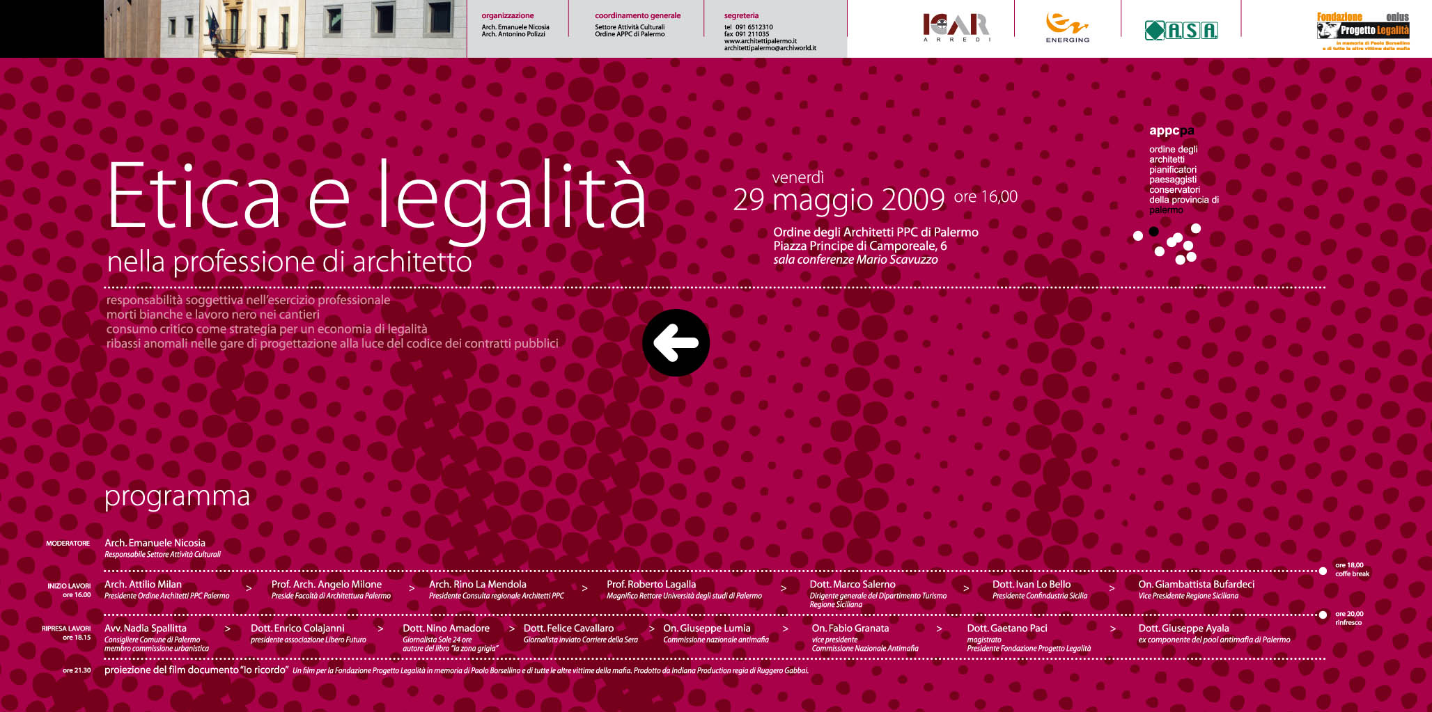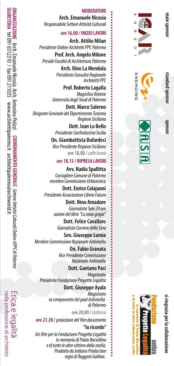 Venerdi 29 maggio 2009 presso la sala conferenze Mario Scavuzzo (Piazza Principe di Camporeale, 6) si svolgerà il forum "Etica e Legalità nella professione di architetto" per discutere di responsabilità soggettiva nell'esercizio professionale, morti bianche e lavoro nero nei cantieri, consumo critico come strategia per un'economia di legalità, ribassi anomali nelle gare di progettazione alla luce del codice dei contratti pubblici.