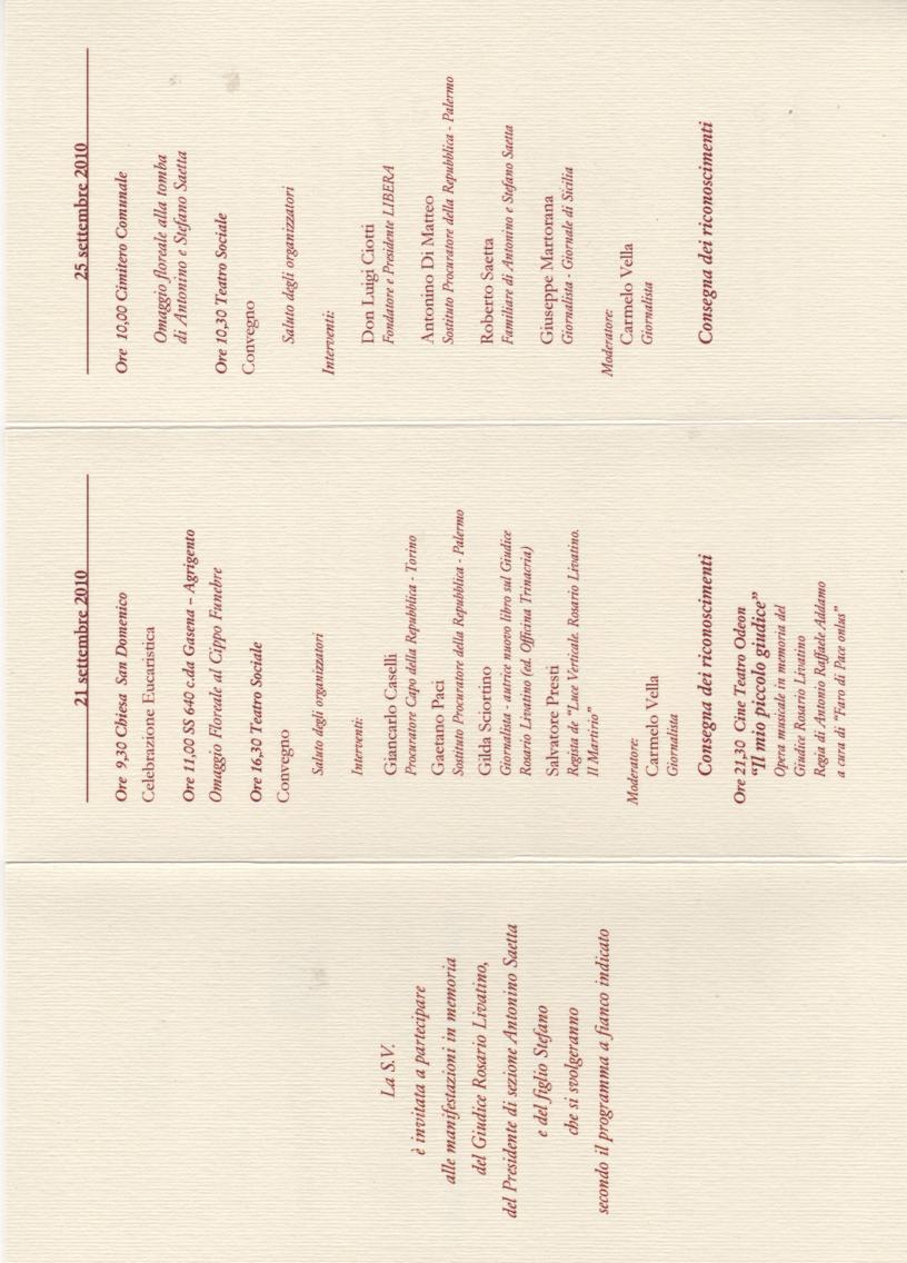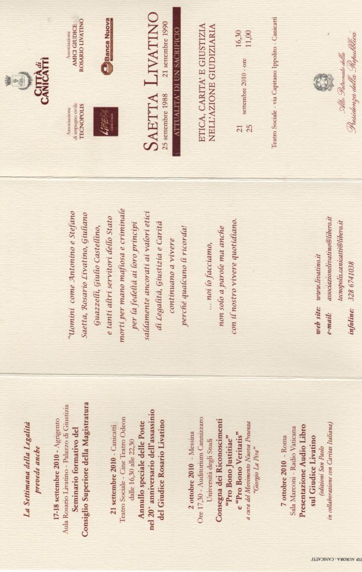 Manifestazioni 21 e 25 settembre 2010 "Settimana della Legalità Giudici Saetta Livatino "
