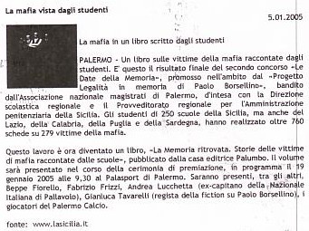Gli studenti di 250 scuole della Sicilia, ma anche del Lazio, della Calabria, della Puglia e della Sardegna, hanno realizzato oltre 760 schede su 279 vittime della mafia. Questo lavoro è ora diventato un libro, "La Memoria Ritrovata. E' il risultato finale del secondo concorso "Le Date della Memoria", promosso nell'ambito del "Progetto Legalitò in memoria di Paolo Borsellino", bandito dall'Associazione Nazionale Magistrati di Palermo, d'intesa con la Direzione scolastica regionale e il Provveditorato regionale per l'Amministrazione penitenziaria della Sicilia.