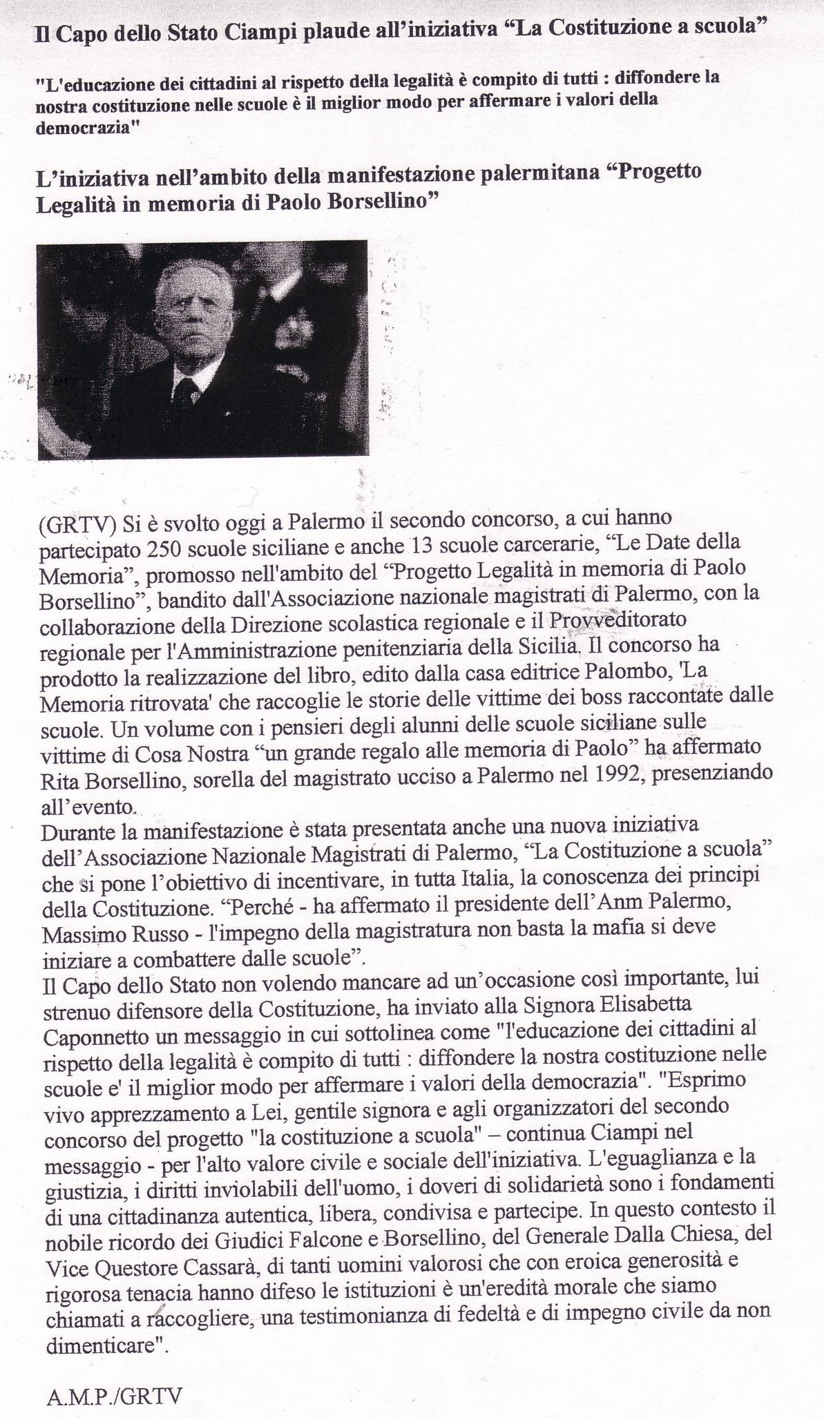 "L'educazione dei cittadini al rispetto della legalità è compito di tutti: diffondere la nostra costituzione nelle scuole è il miglior modo per affermare i valori della democrazia". L'iniziativa nell'ambito della manifestazione palermitana "Progetto Legalità in memoria di Paolo Borsellino"