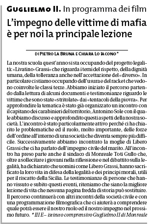 La nostra scuola quest'anno si sta occupando del progetto legalità: «Livatino - Grassi» che riguarda il tema del rispetto, della dignità umana, della tolleranza anche nell'accettazione del «diverso». In particolare ci stiamo occupando dell'usura e del racket.....