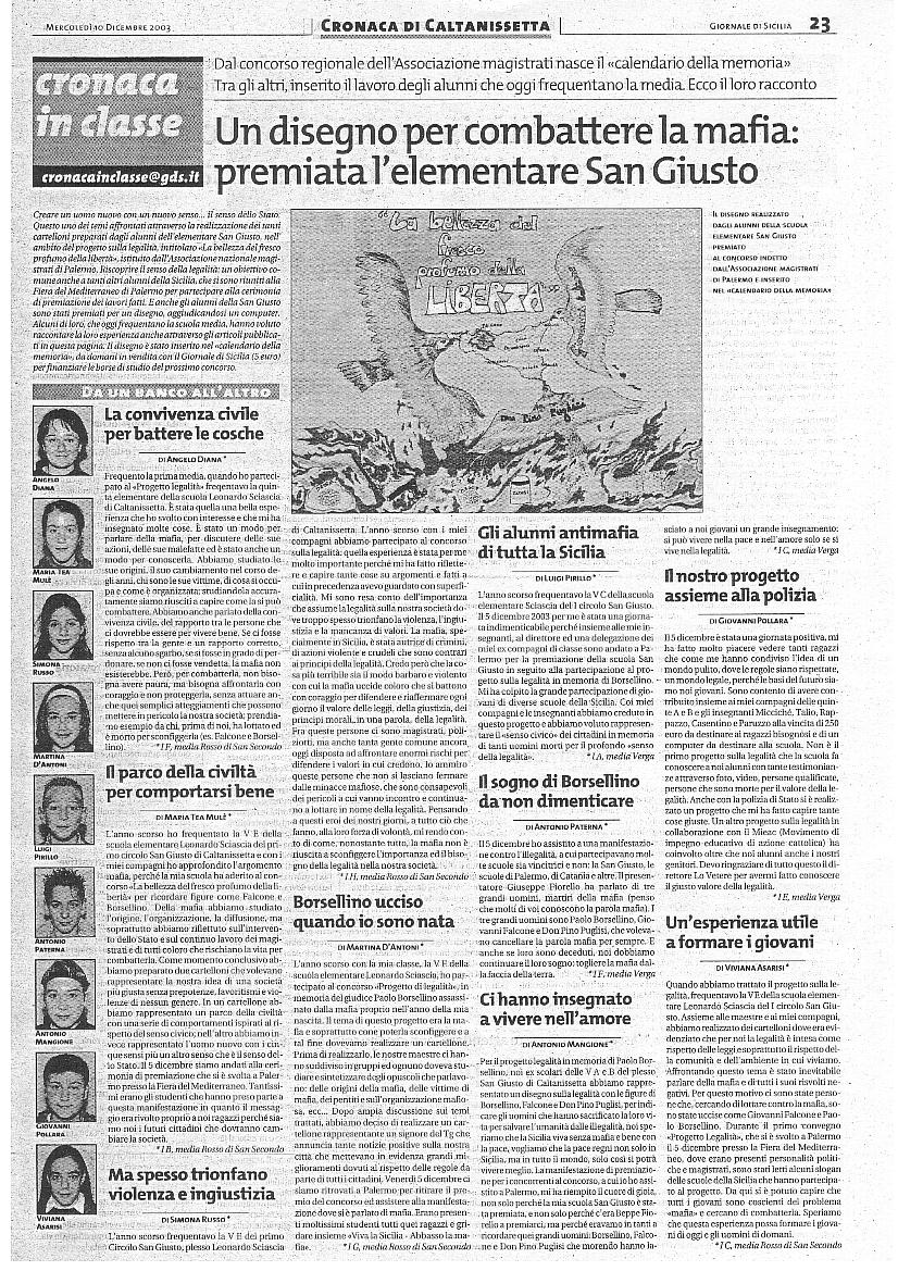 La convivenza civile per battere le cosche; Il parco della civiltĂ per comportarsi bene; Ma spesso trionfano violenza e ingiustizia; Borsellino ucciso quando io sono nata; Gli alunni antimafia di tutta la Sicilia; Il sogno di Borsellino da non dimenticare; Ci hanno insegnato a vivere nell'amore; Il nostro progetto assieme alla polizia; Un'esperienza utile a formare i giovani.