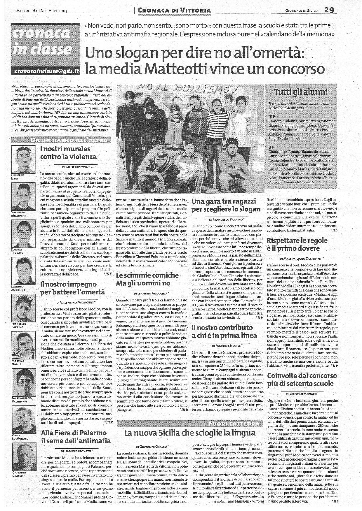 I nostri murales contro la violenza; Il nostro impegno per battere l'omertà; Alla Fiera di Palermo il seme dell'antimafia; Le scimmie comiche. Ma gli uomini no; una gara tra ragazzi per scegliere lo slogan; Il nostro contributo a chi è in prima linea; Rispettare le regole è il primo dovere; Coinvolte del concorso più di seicento scuole; La nuova Sicilia che scioglie la lingua.